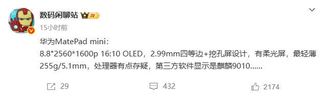 近日,博主@数码闲聊站 发文透露:“华为MatePad mini:8.8"2560*1600p 16:10 OLED,2.99mm四等边+挖孔屏设计,有柔光屏,最轻薄255g/5.1mm,处理器有点存疑,第三方软件显示是麒麟9010”。这下好了,华为MatePadmini的“底裤”彻底被掀开了。